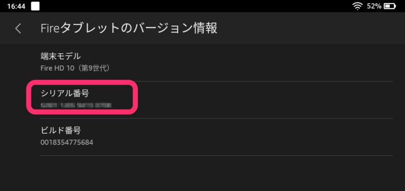 Fireタブレットのバージョン情報」画面で「シリアル番号」を7回連続でタップします。