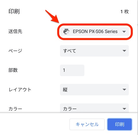 「送信先」には以降の手順でChromebookに接続されているプリンタがリストされます。