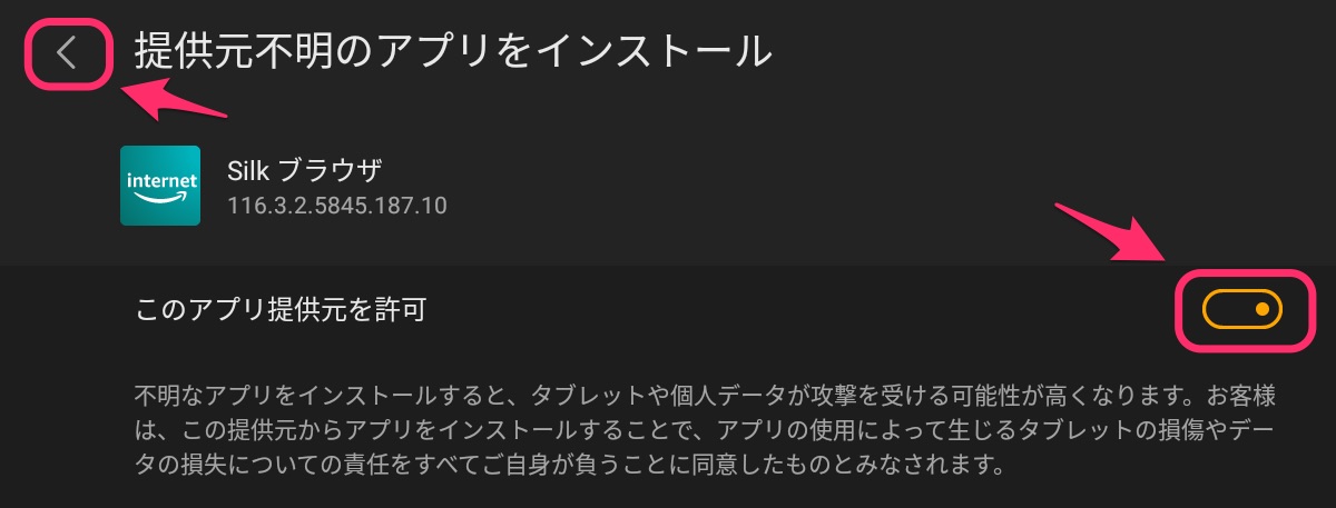 「このアプリの提供元を許可」をONにし、左上の「<」をタップします。